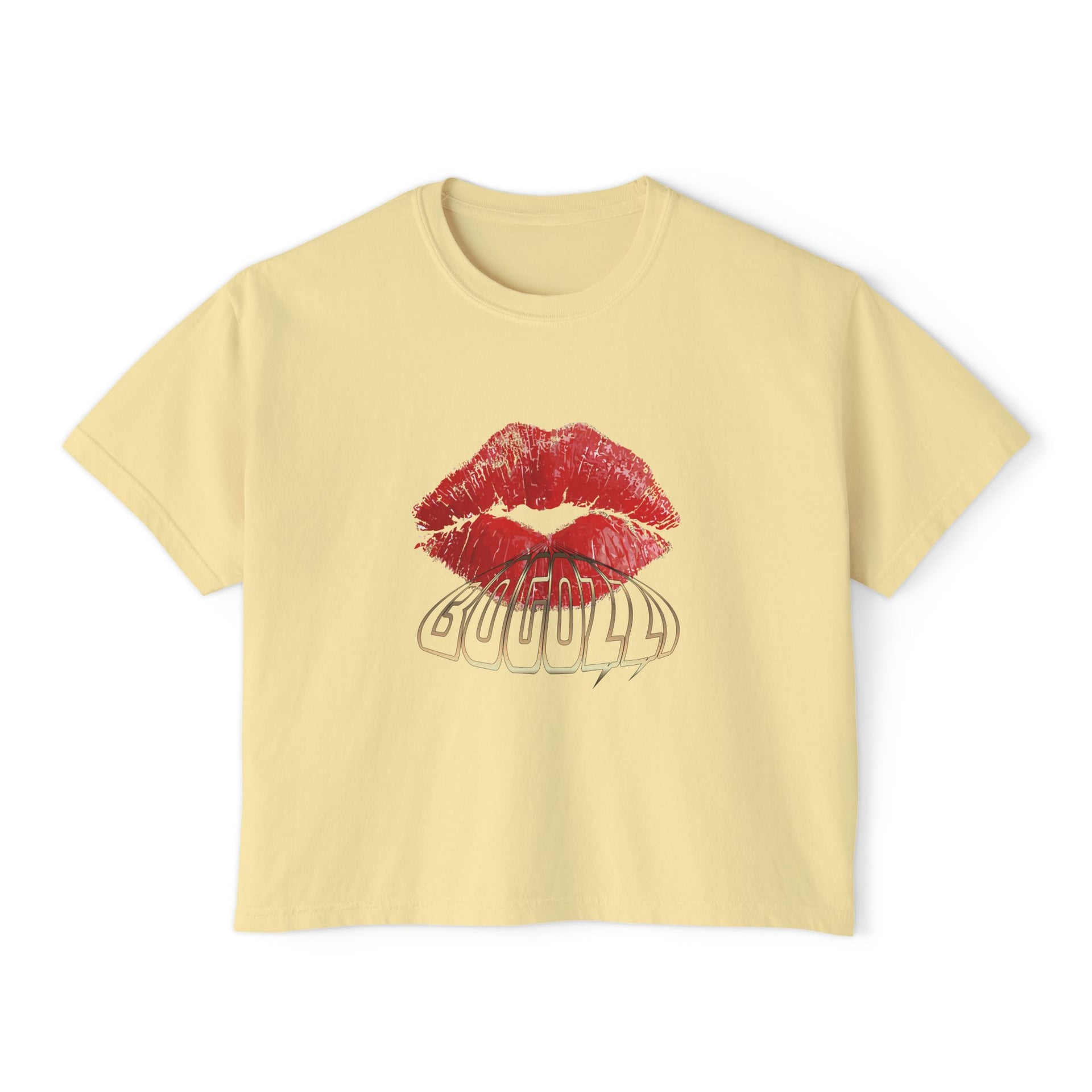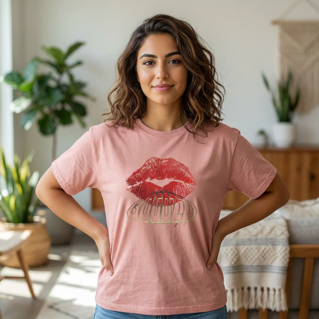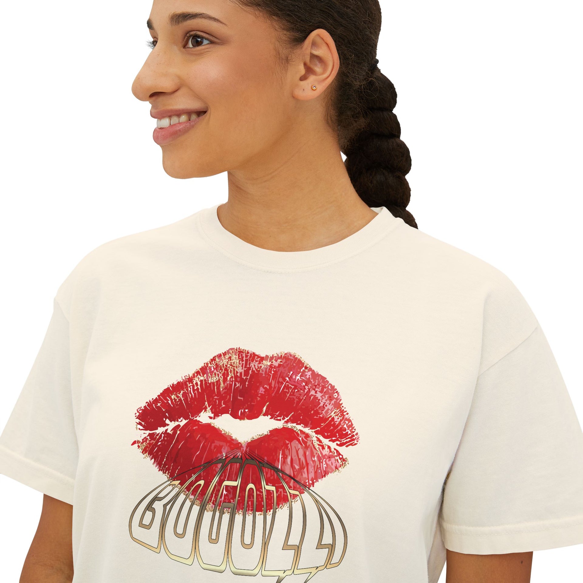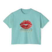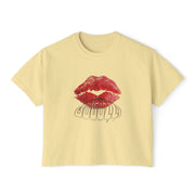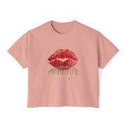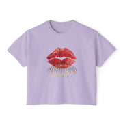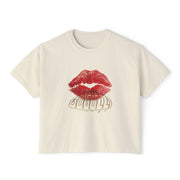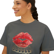 This boxy tee brings a playful, confident edge to everyday wear. The bold red lips with a gold kiss graphic reads like a wink—flirty without shouting—so you can move through crowded rooms or quiet cafes feeling mischievous and comfortably put-together. The cropped, boxy silhouette skims the waist and hides the extra winter fluff while keeping lines modern and relaxed. Wear it with high-waisted jeans, a slip skirt, or layered under a blazer for a look that’s equal parts cozy and cheeky. The pigment-dyed finish gives a lived-in, vintage warmth that softens the graphic and adds quiet personality. Set your mood with the variety of different color options available.