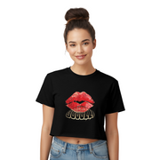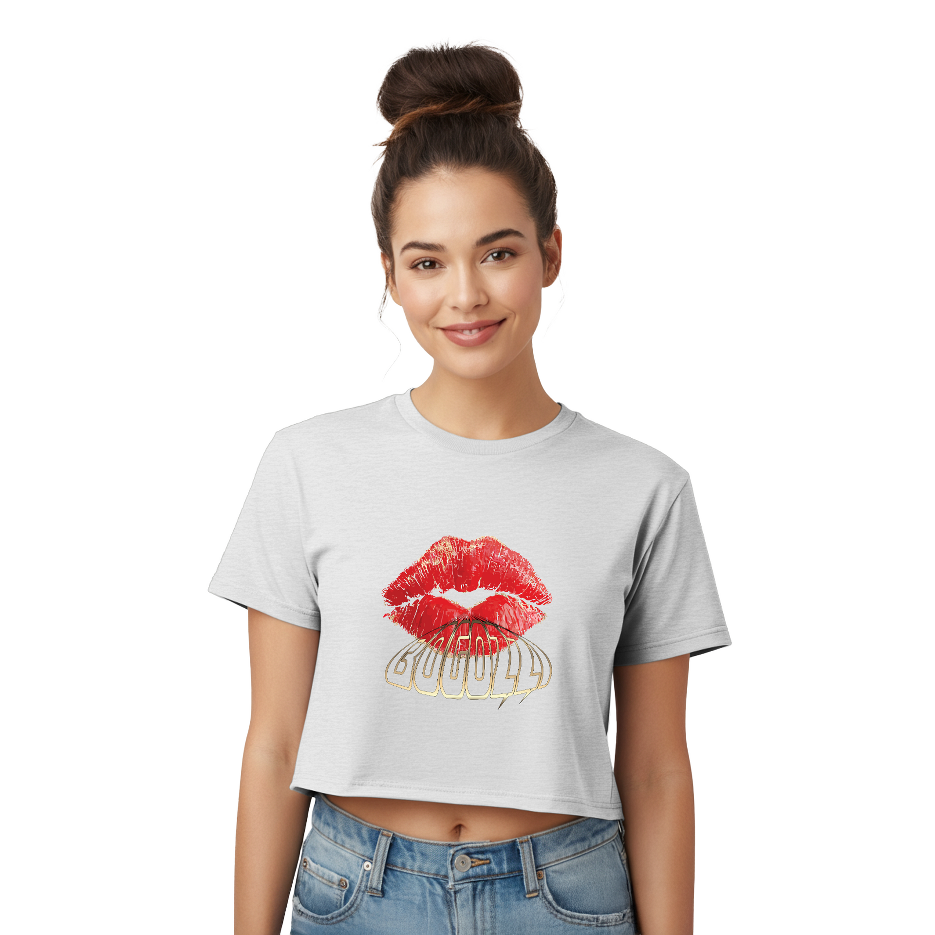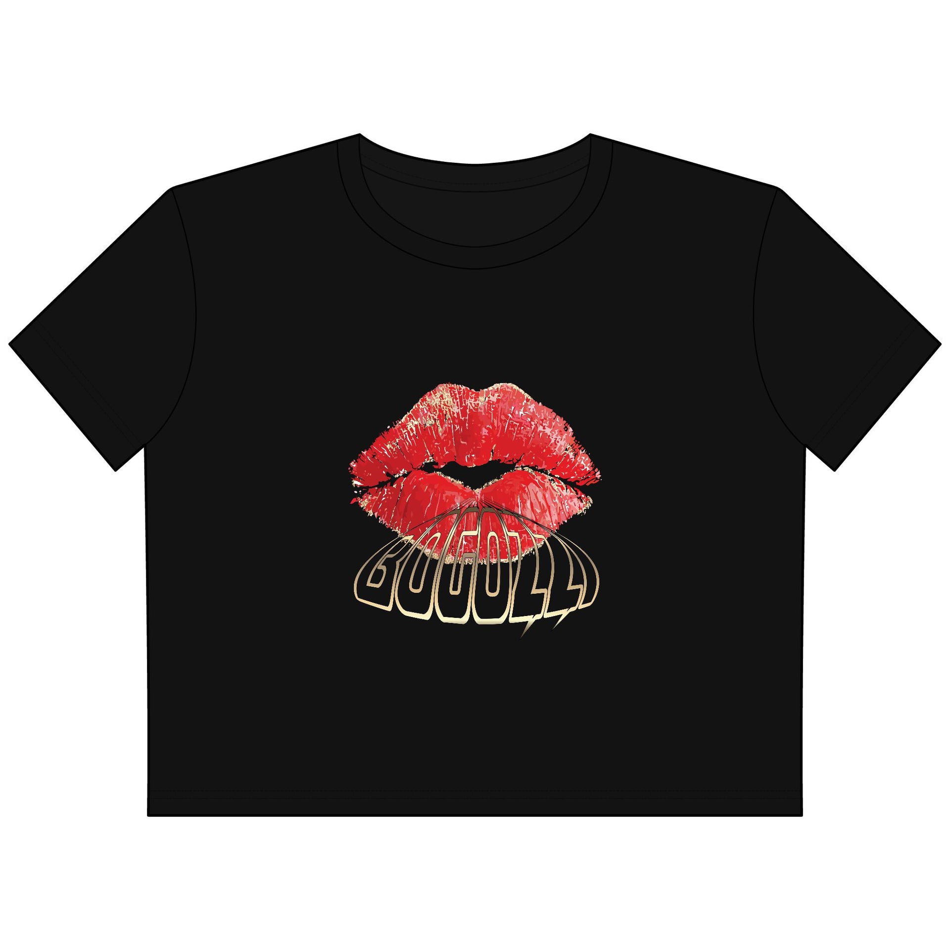 This cropped boxy tee brings playful confidence to everyday wear. A bold kiss-print graphic sits at the chest, its red and gold tones catching the eye against all three contrasting color options. The mid cropped, relaxed silhouette pairs easily with high-waisted jeans, skirts, or layered under an oversize blazer. Lightweight and soft to the touch, the blend of cotton and polyester holds shape and print detail wash after wash. Sizes run inclusive from S to 5XL so more people can wear the look and feel comfortable doing it — whether out for coffee, dancing with friends, or adding a pop of attitude to a casual evening out.